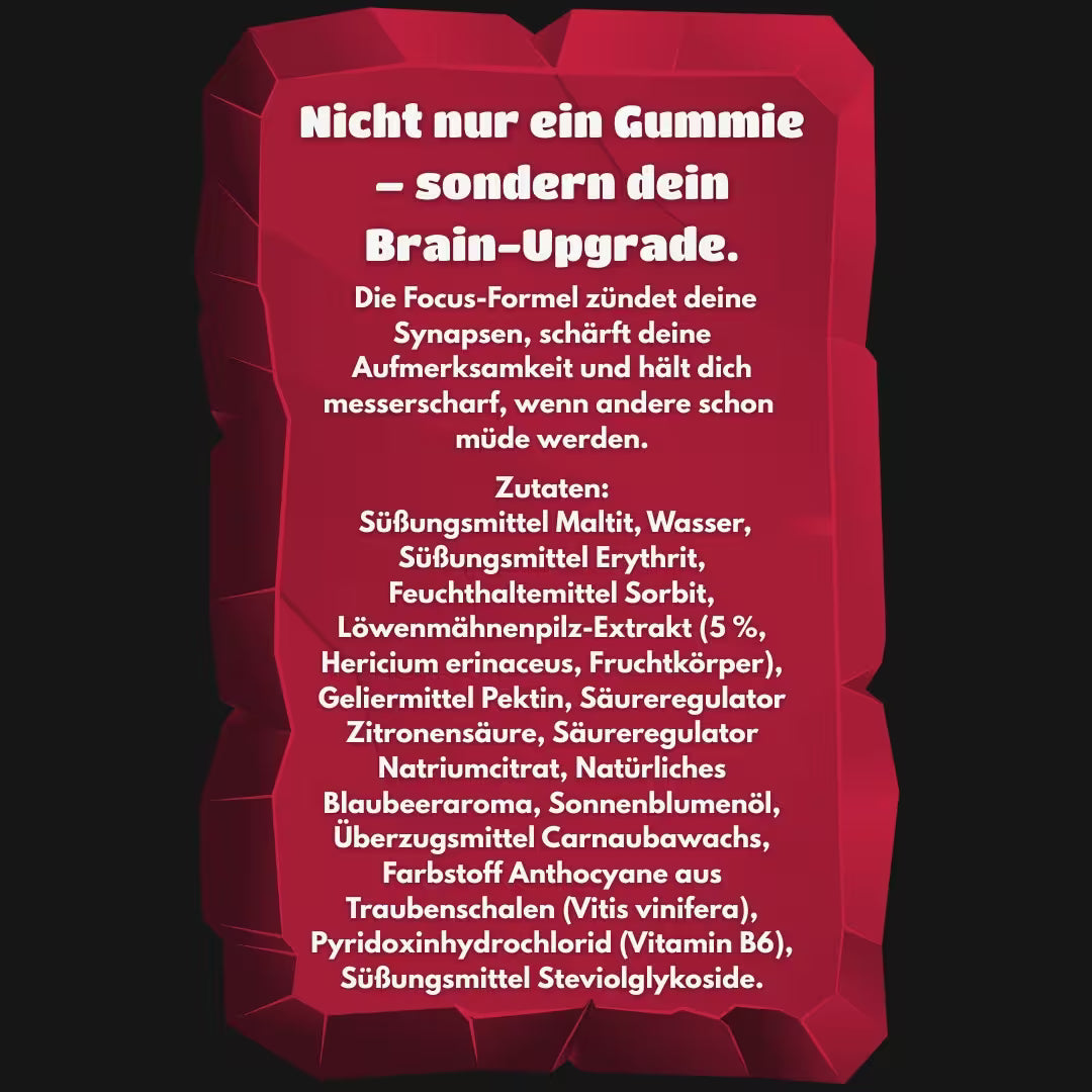 FOCUS ist kein Zuckerwasser mit Crash-Garantie, sondern ein smarter Gaming-Gummie mit 200 mg Löwenmähnenpilz + Vitamin B6.